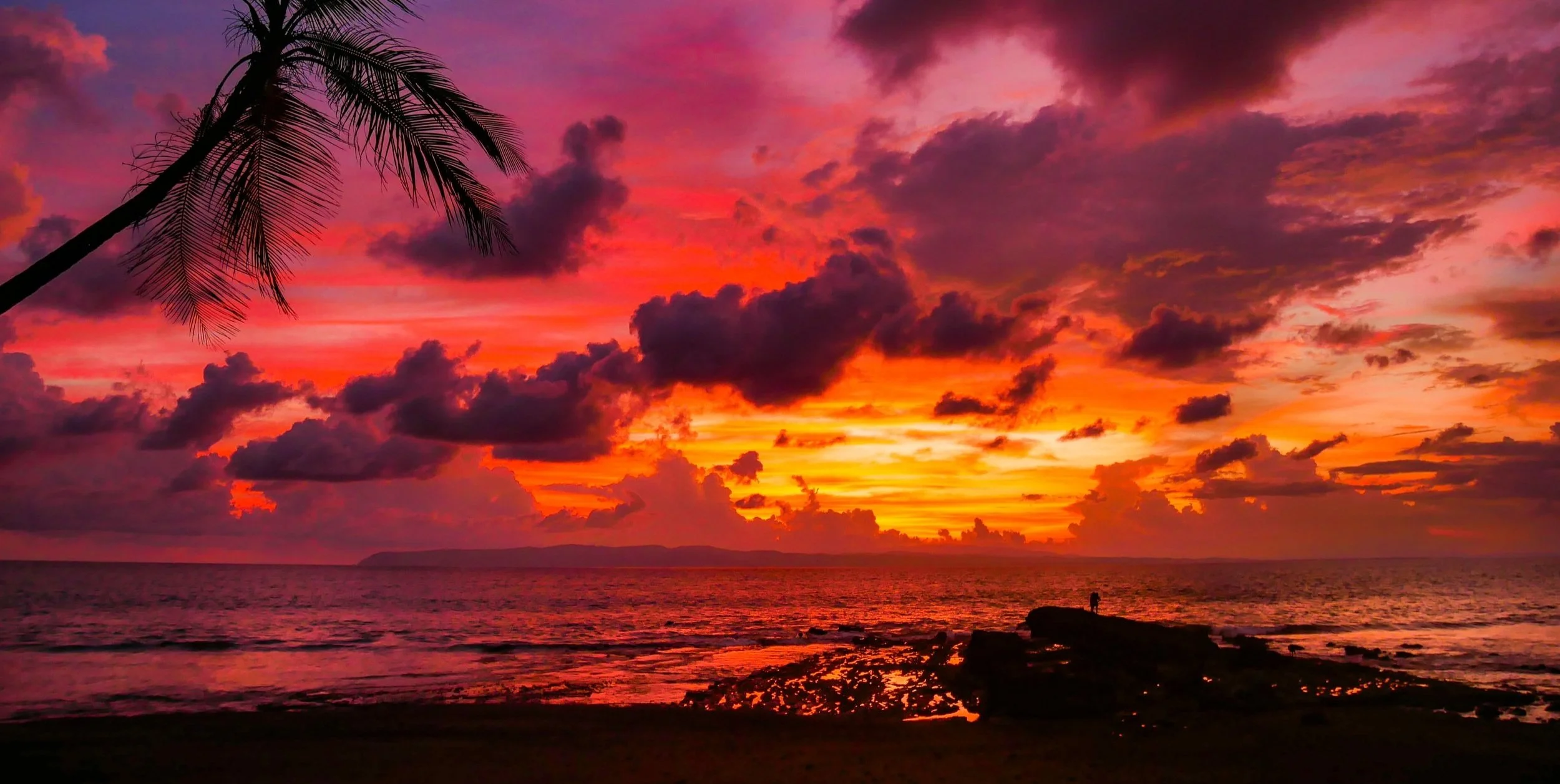 Shot from the sunset lookout near Las Gemelas, this fiery scene glows with deep reds, golds, and purples. A palm silhouette frames the sky, while a couple stands on the rocks, bathed in warm light and gazing toward Matapalo.