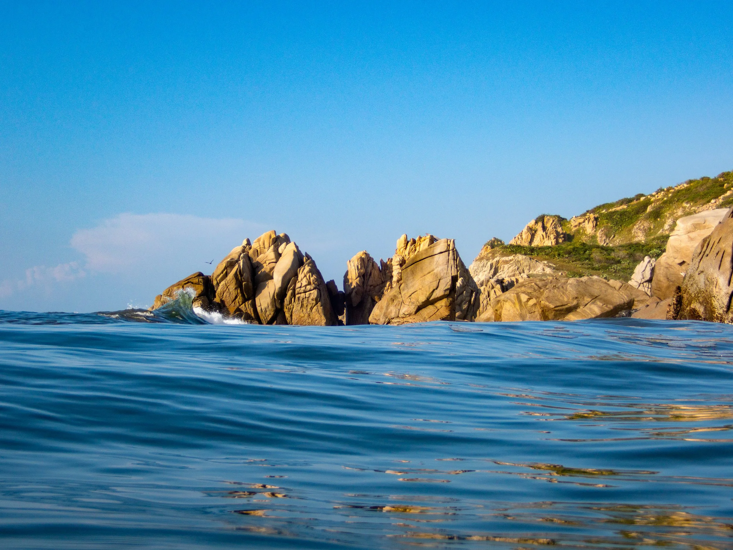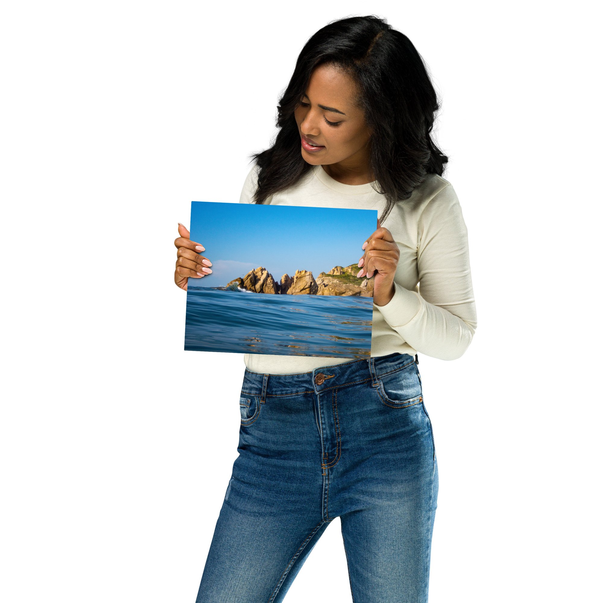 Shot in the water mid-session, this scene captures the face in the rocks, framed by rugged sandstone. To the right, greenery prevails; to the left, a shoaling wave lifts with movement and anticipation. 50% of proceeds donated.