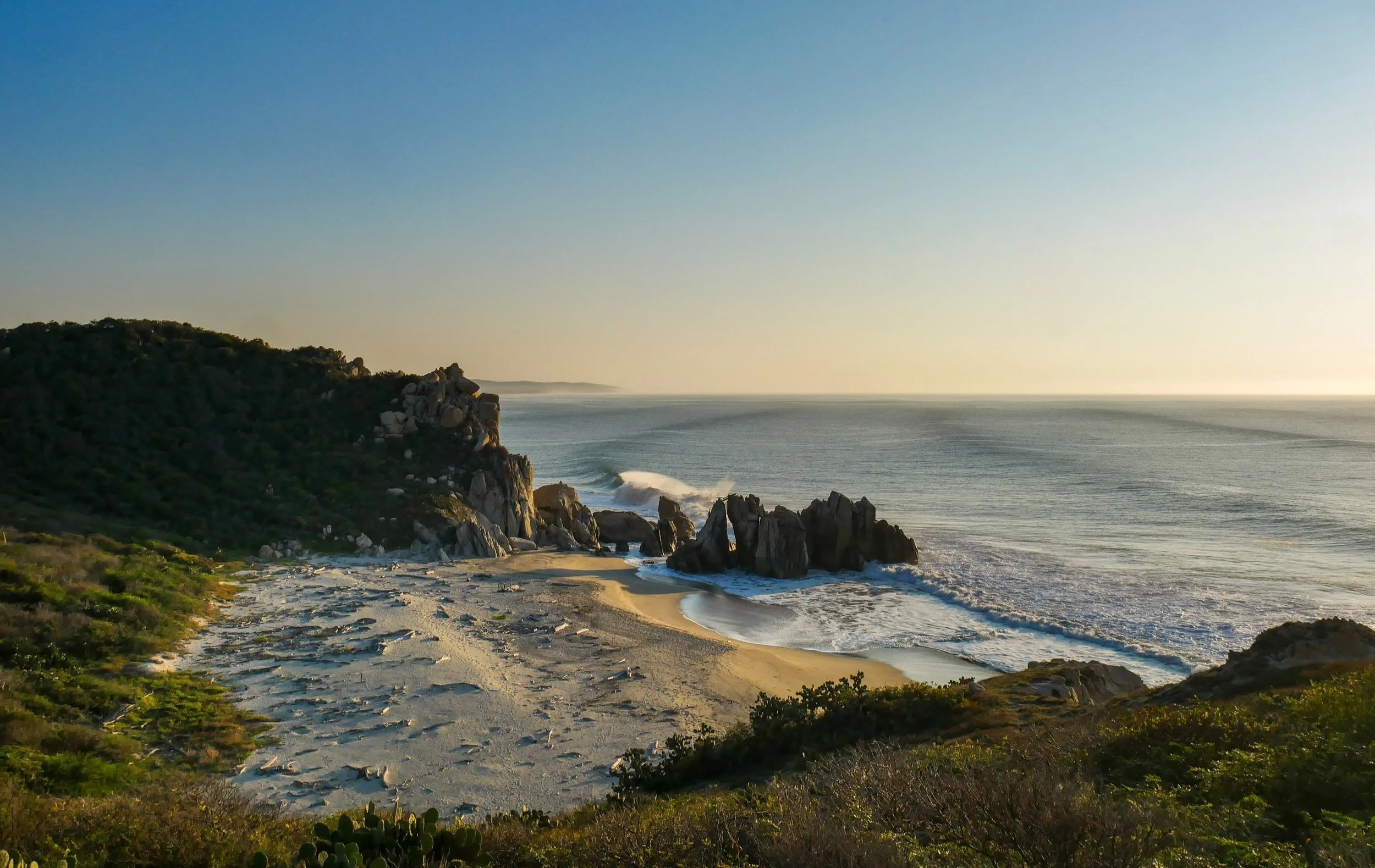 This elevated shot of Barra de la Cruz captures La Playita below, framed by lush shrubs, with the iconic wave breaking over the sandbar and swell lines stretching to the horizon. 50% proceeds donated.