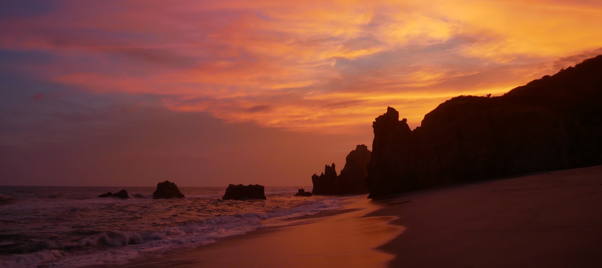 A deep red sunset bathes the beach in crimson hues, painting the water and sand in warm shades, while the sky glows with red, orange, and yellow, contrasting beautifully with the rocky cliff outcrop. 50% of proceeds donated.