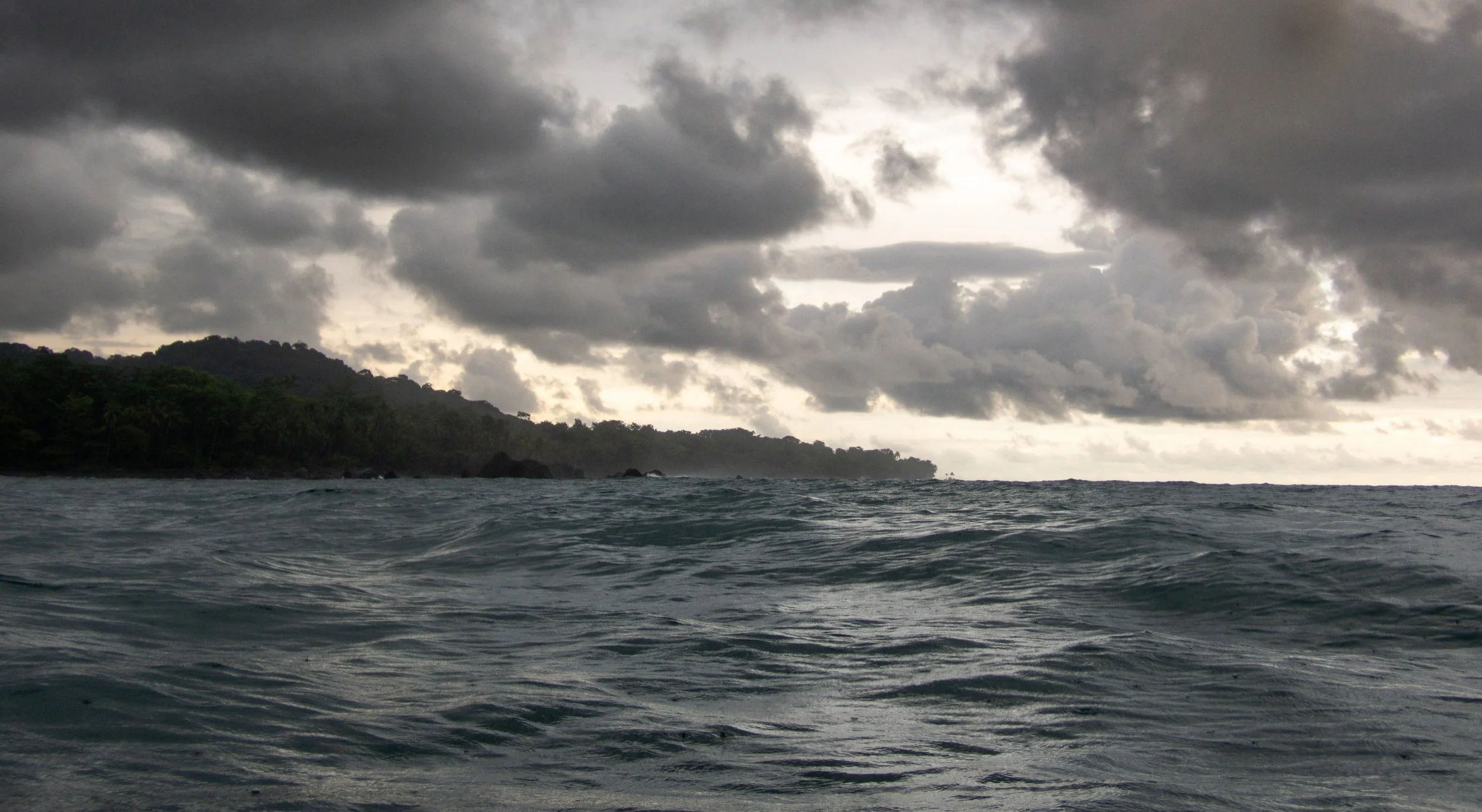 Shot from the water on a stormy day, this view looks south toward Punta Banco, where jungle, rock, and sea meet under heavy clouds. Moody and powerful, the scene captures the raw beauty of the coast just before the rain.