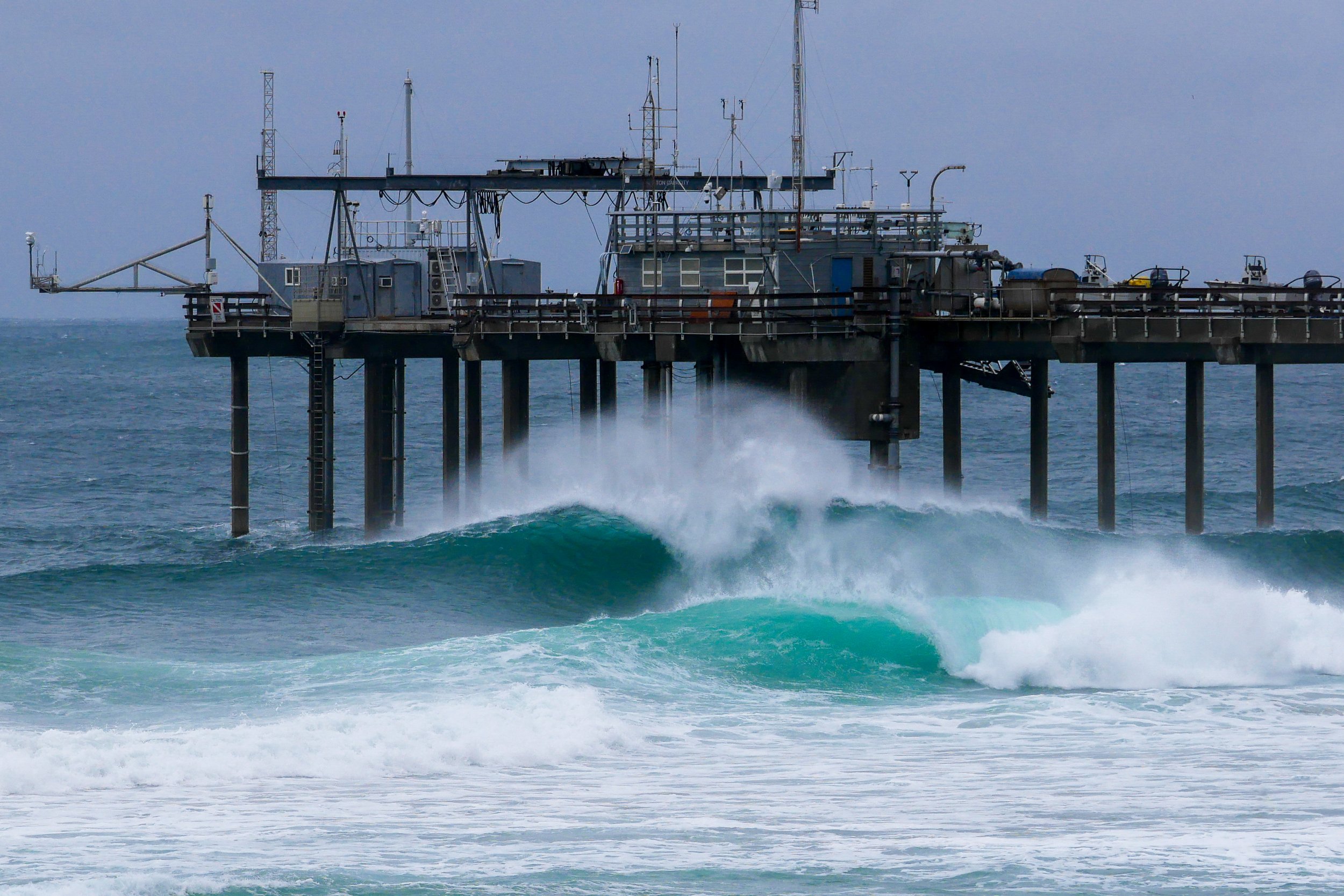A solid right breaks in front of Scripps Pier in San Diego, California. Rebuilt in 1988 to replace the original pier from 1916, the Ellen Browning Scripps Memorial Pier is one of San Diego's most iconic landmarks.