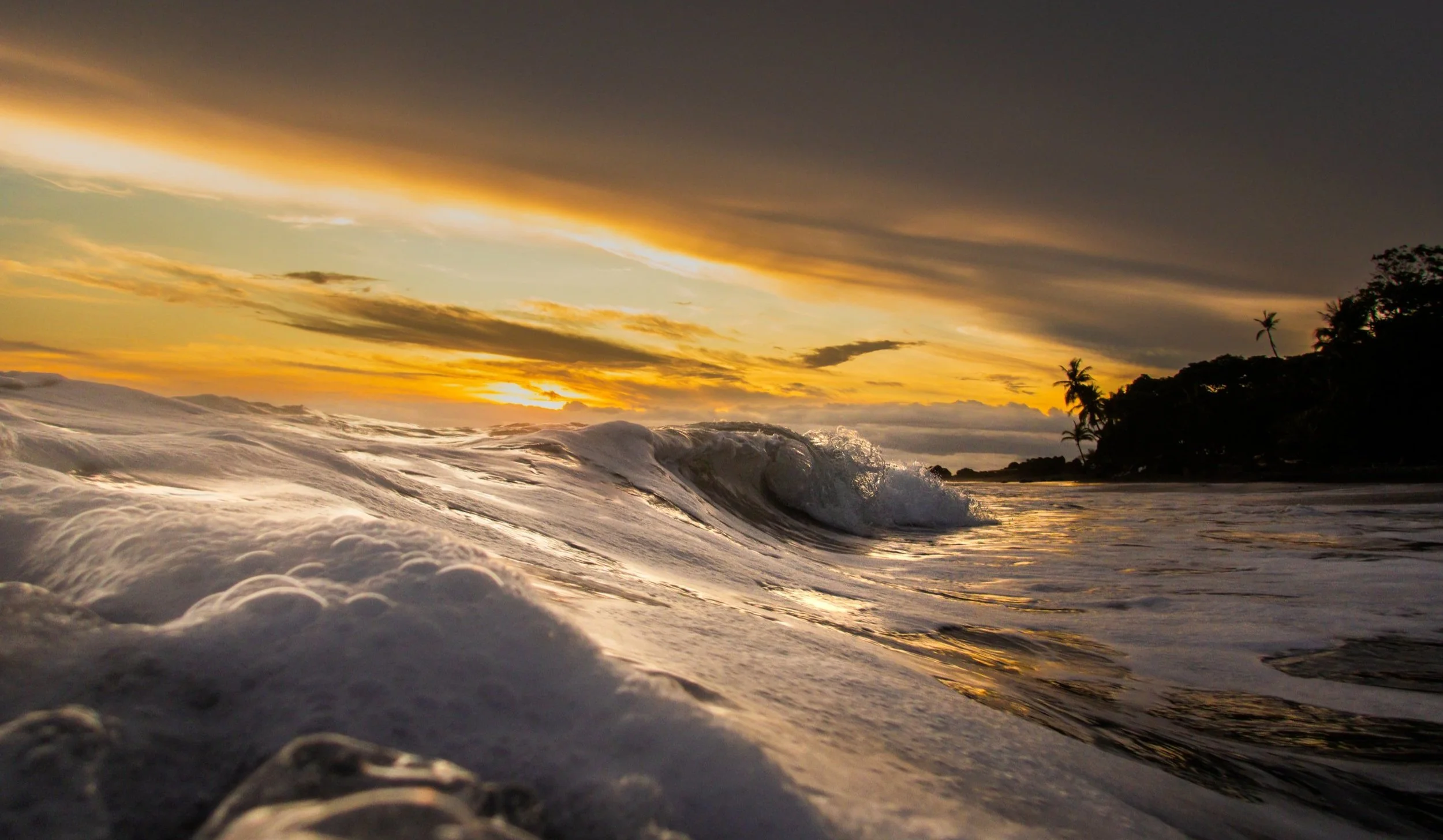 Shot in the shorebreak near La Ponderosa beach, a wave reflects golden hues from the bright sunset. The silhouette of the beach and palm trees adds depth to this dynamic, golden moment.