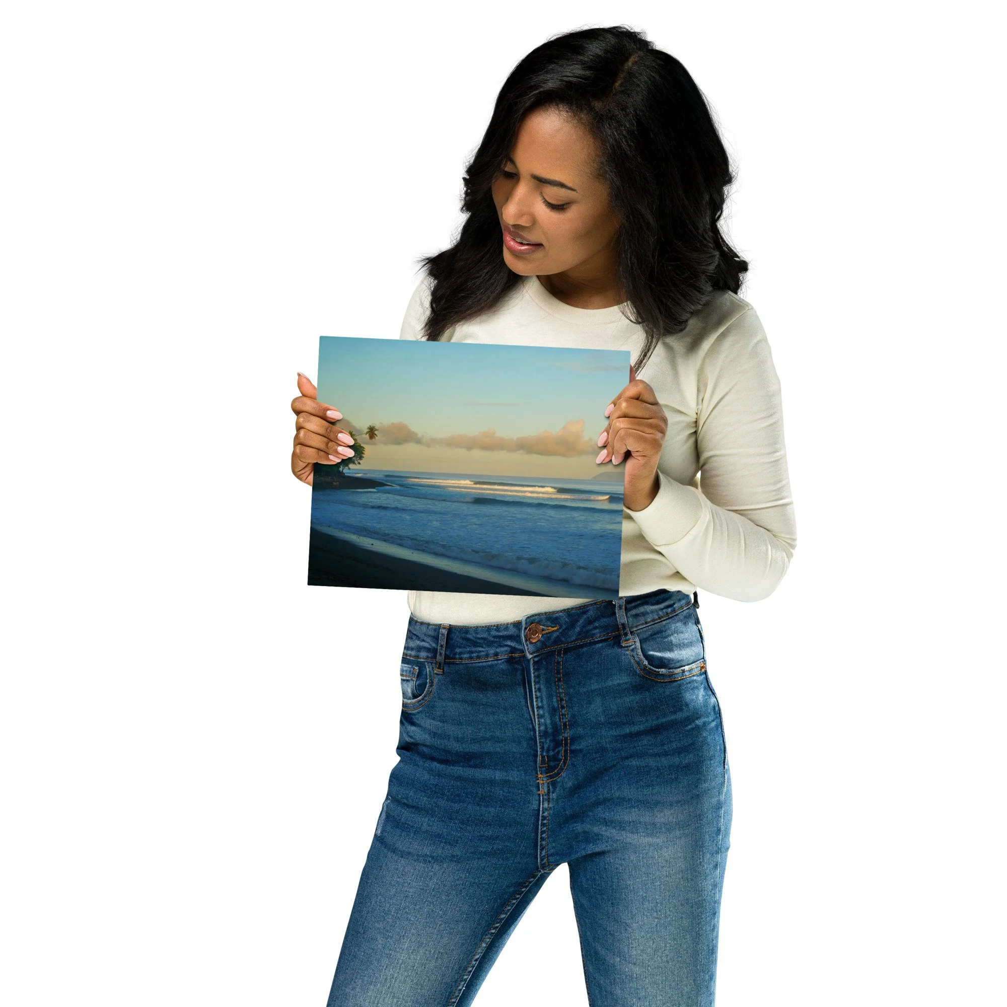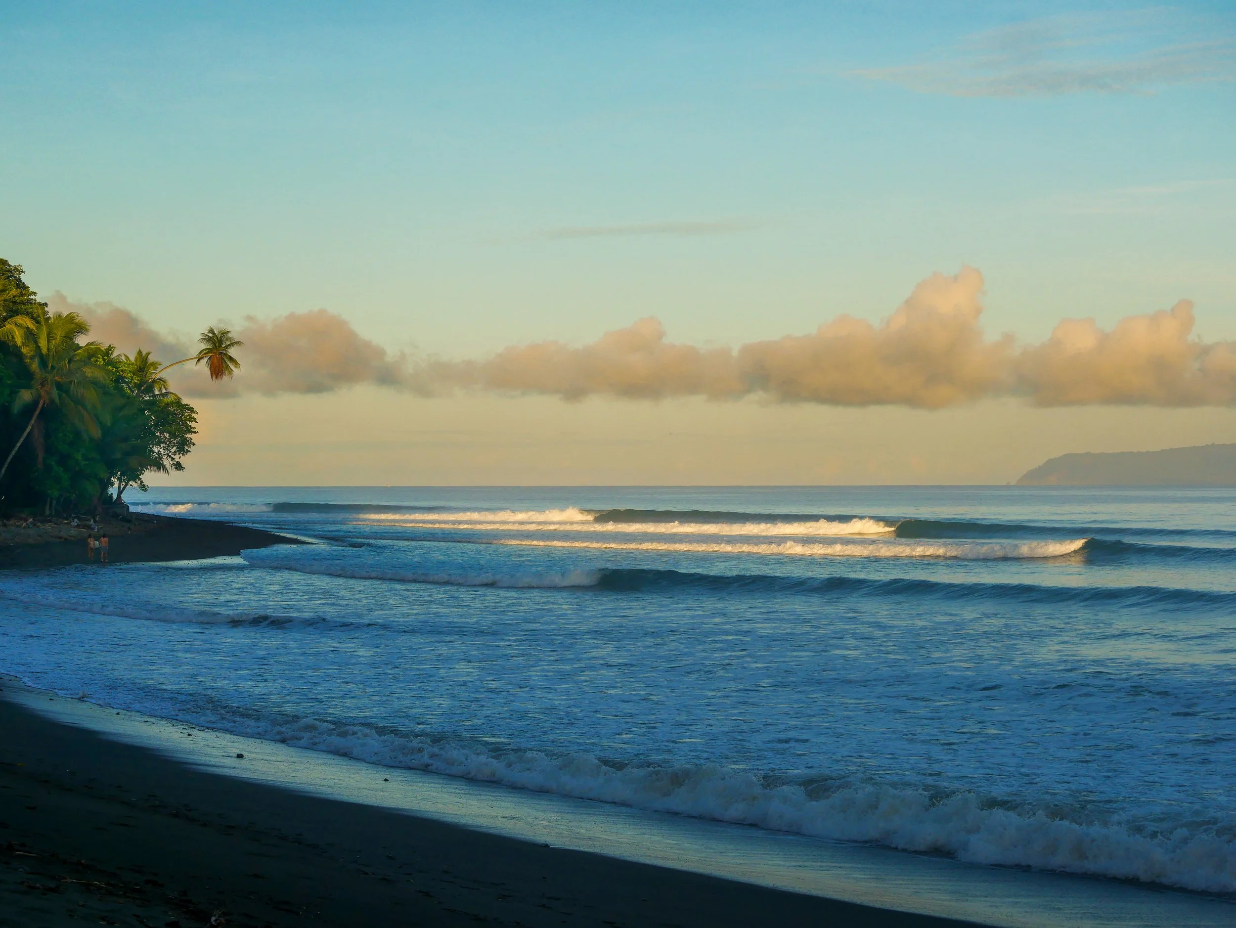 Captured during golden hour from the beach, this classic tropical surf scene shows the Wall section in Pavones peeling perfectly, framed by palms on the left and Matapalo on the right. Soft colors and a few onlookers complete the scene.