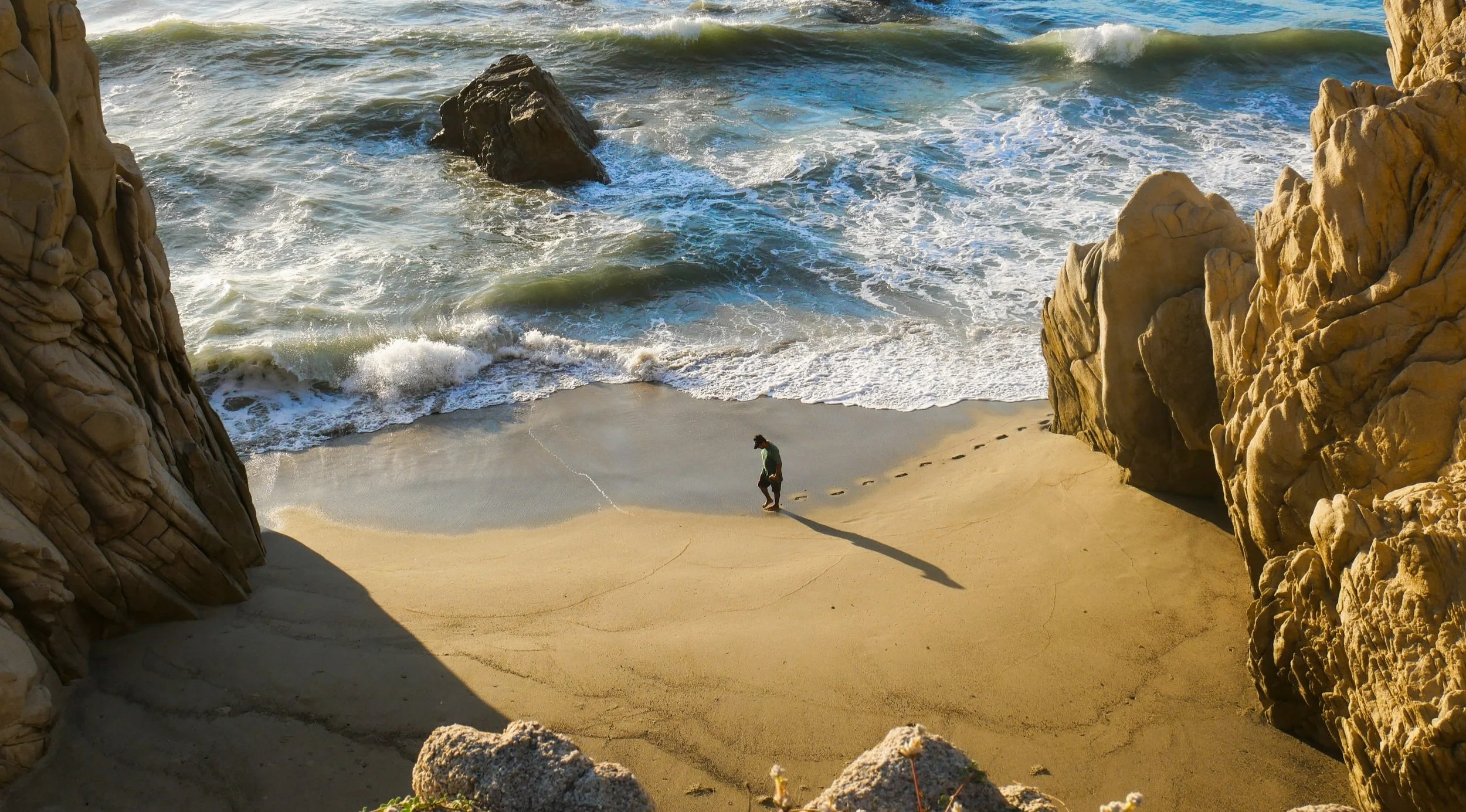 From the cliff’s edge, a fisherman walks along the beach, his footprints marking the golden sand. Surrounded by ocean, rocks, and cliffs, his journey unfolds quietly, leaving a story in the sand. 50% of proceeds donated.