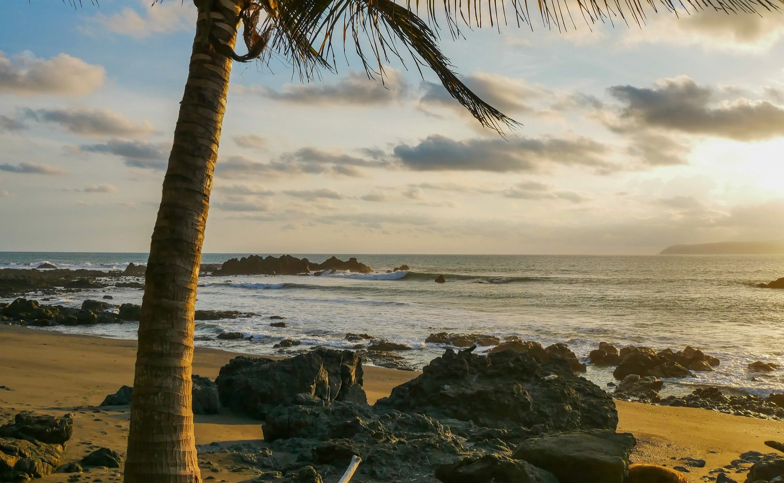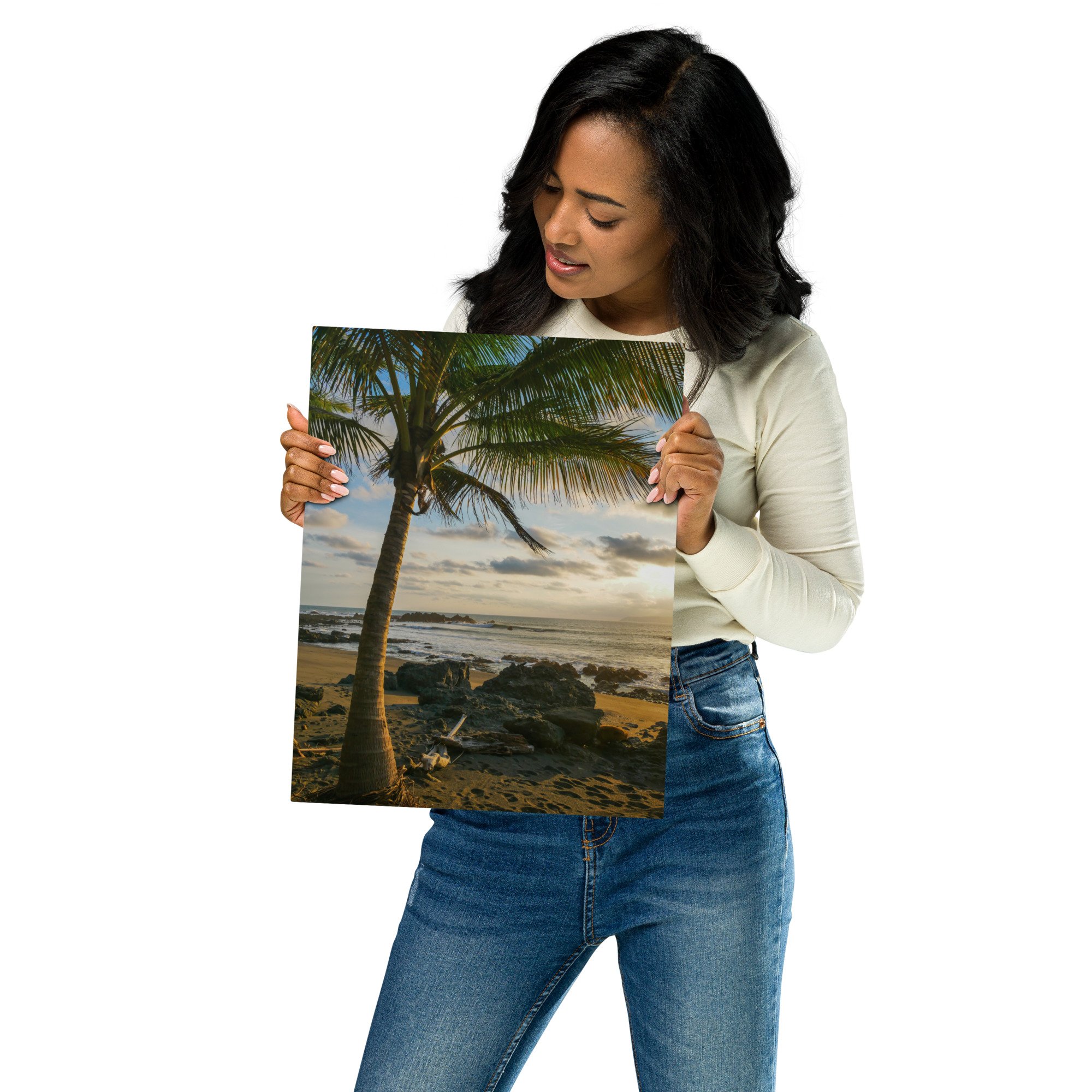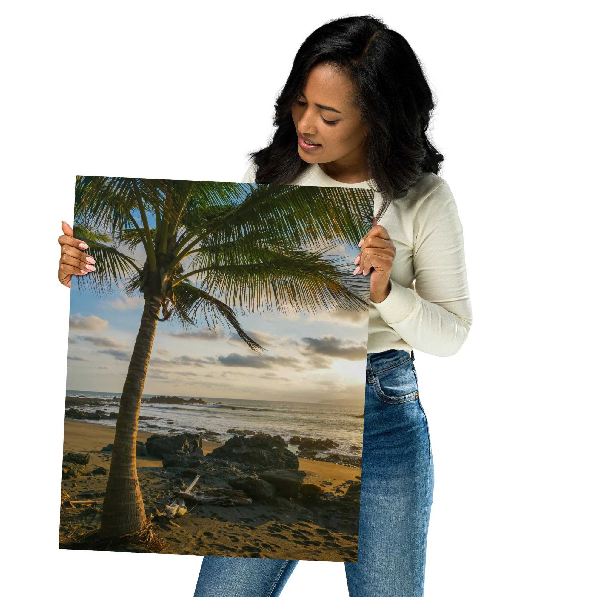 A lone palm tree gently frames the scene, guiding the eye to a peeling left-hander with Matapalo in the distance. The beach glows in soft golden hues, bathed in the warm, tranquil light of the late afternoon.