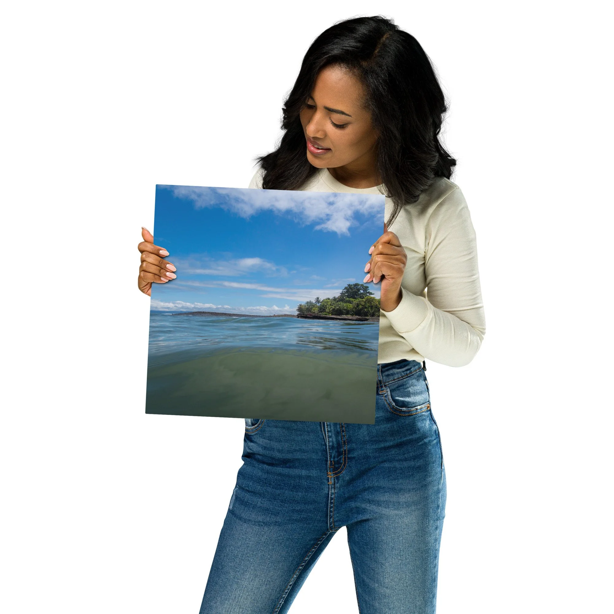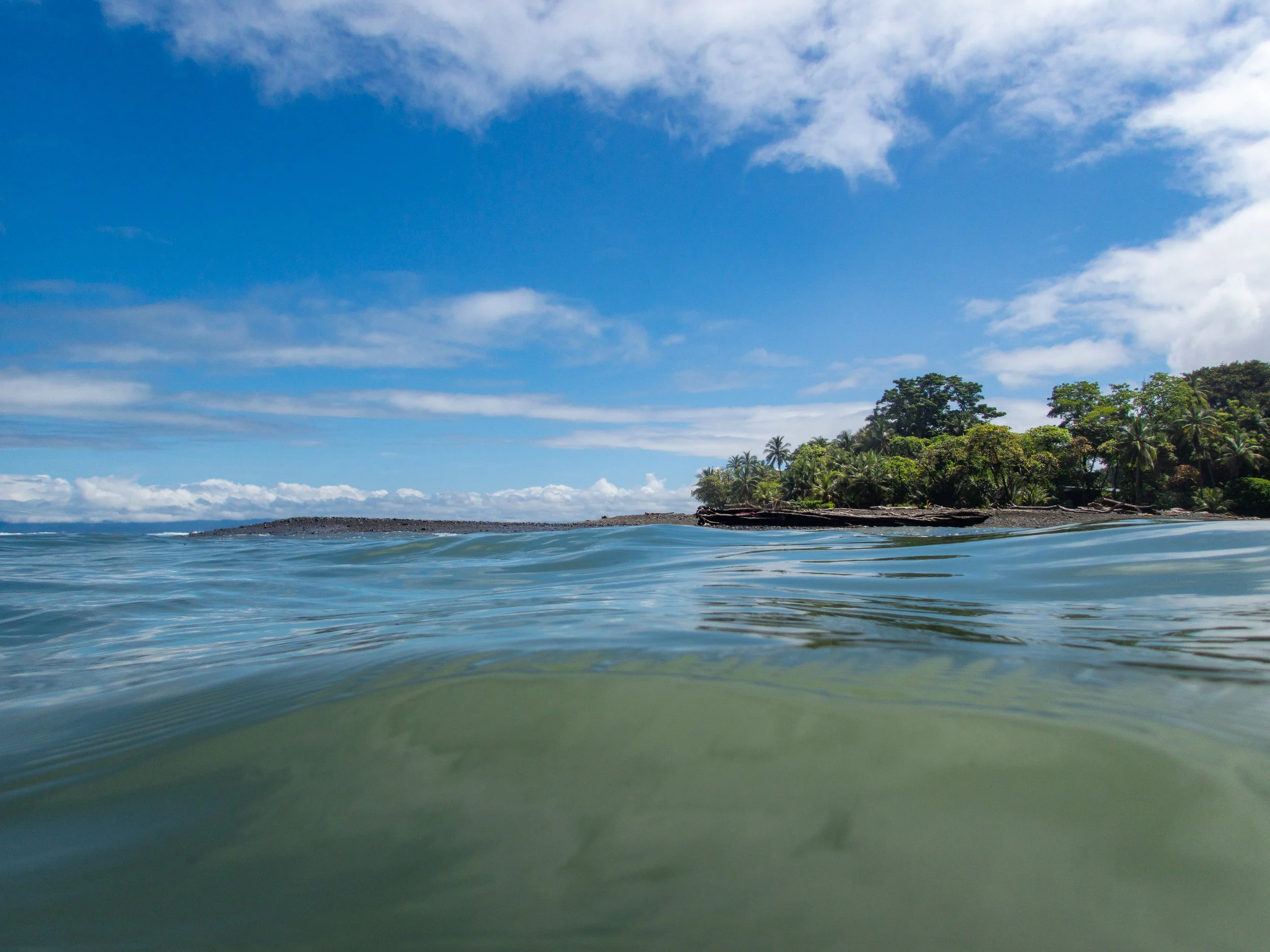 Shot from the water, nearly immersed in the Rio Claro as it flows into Playa Pavones, this image faces the jungle and rocky shoreline, with large pieces of driftwood scattered after each rain, adding to the raw, natural beauty of the scene.