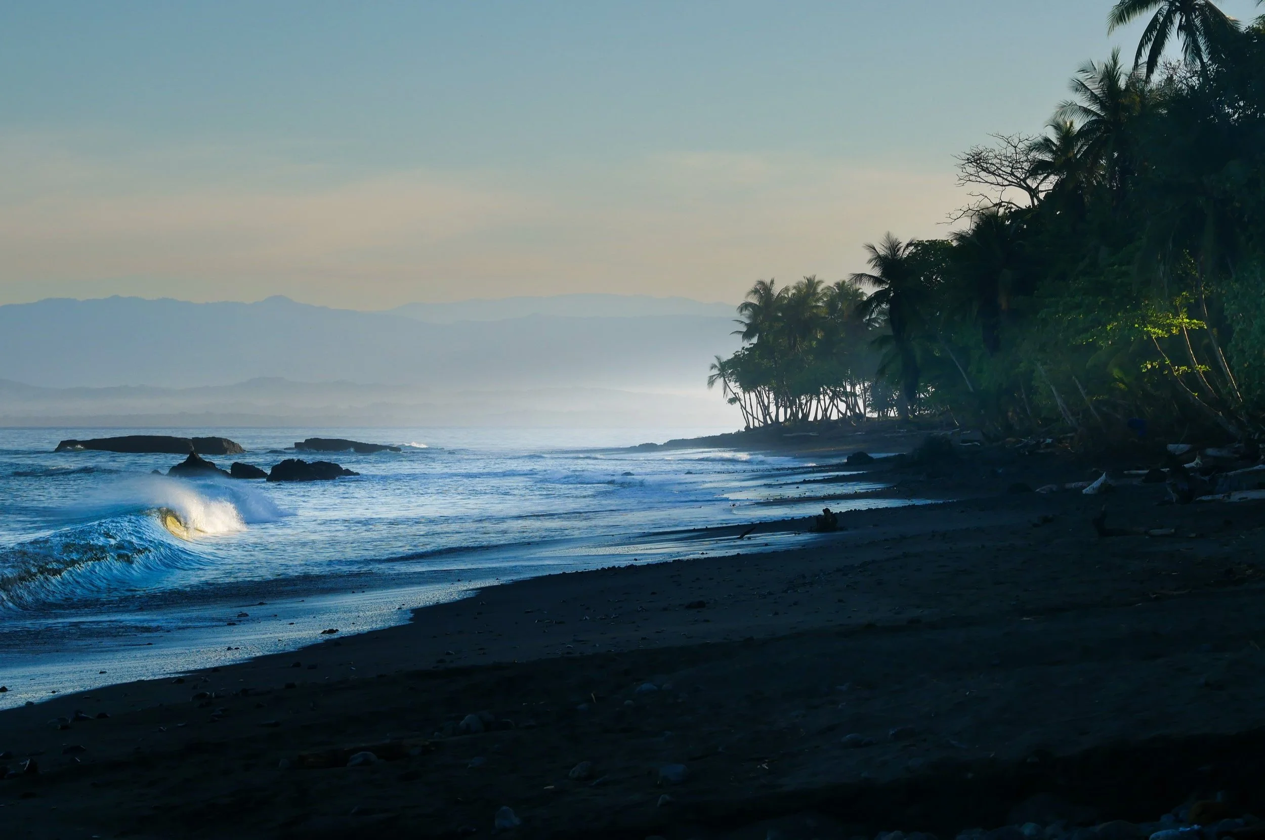 Shot at first light, this view looks north past the Pescaría, where jungle, sand, and sea meet in quiet harmony. A golden sunbeam breaks through the trees, striking a small shorebreak just as it curls and illuminating its heart.