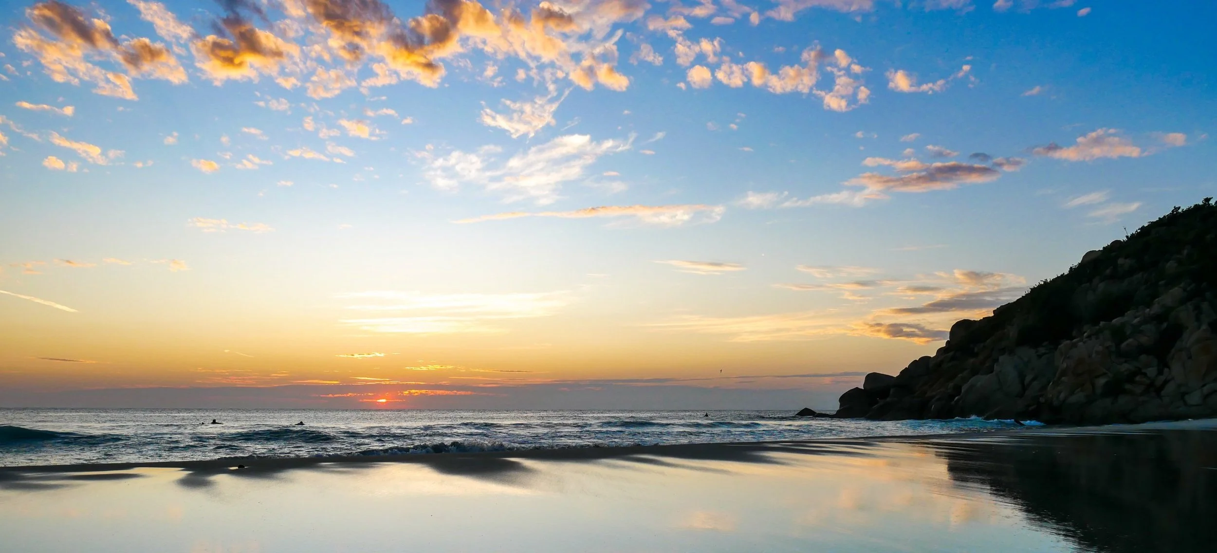 A surreal moment where the sky is perfectly mirrored in the wet sand—orange clouds streaked like a painting. At the center, the sun rises over the ocean, framed by a rocky outcrop anchoring the scene. 50% of proceeds donated.