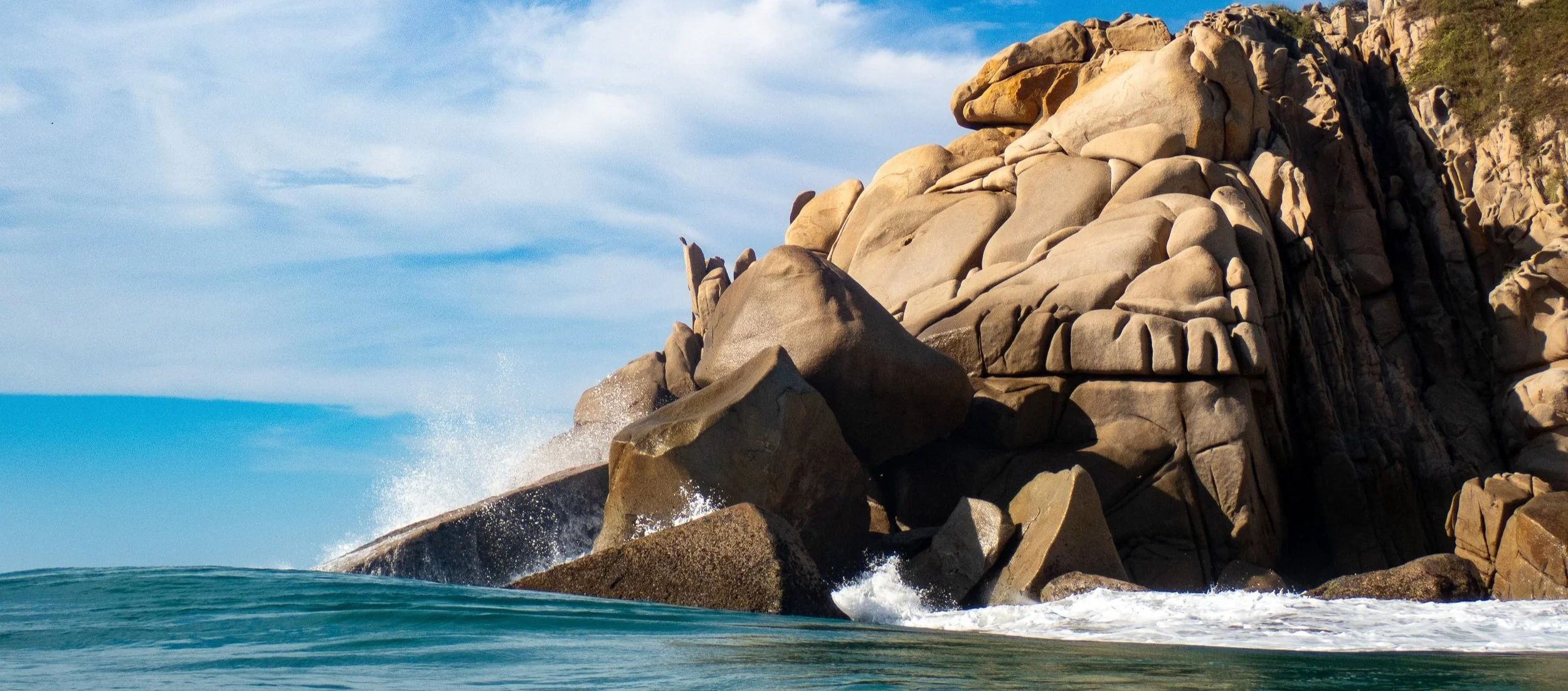 A daylight take on the iconic thumbs-up rock, its cheerful form lit crisp and clear as waves crash against it, sending up bursts of sea spray—capturing the energy and spirit of this legendary surf spot. 50% of proceeds donated.