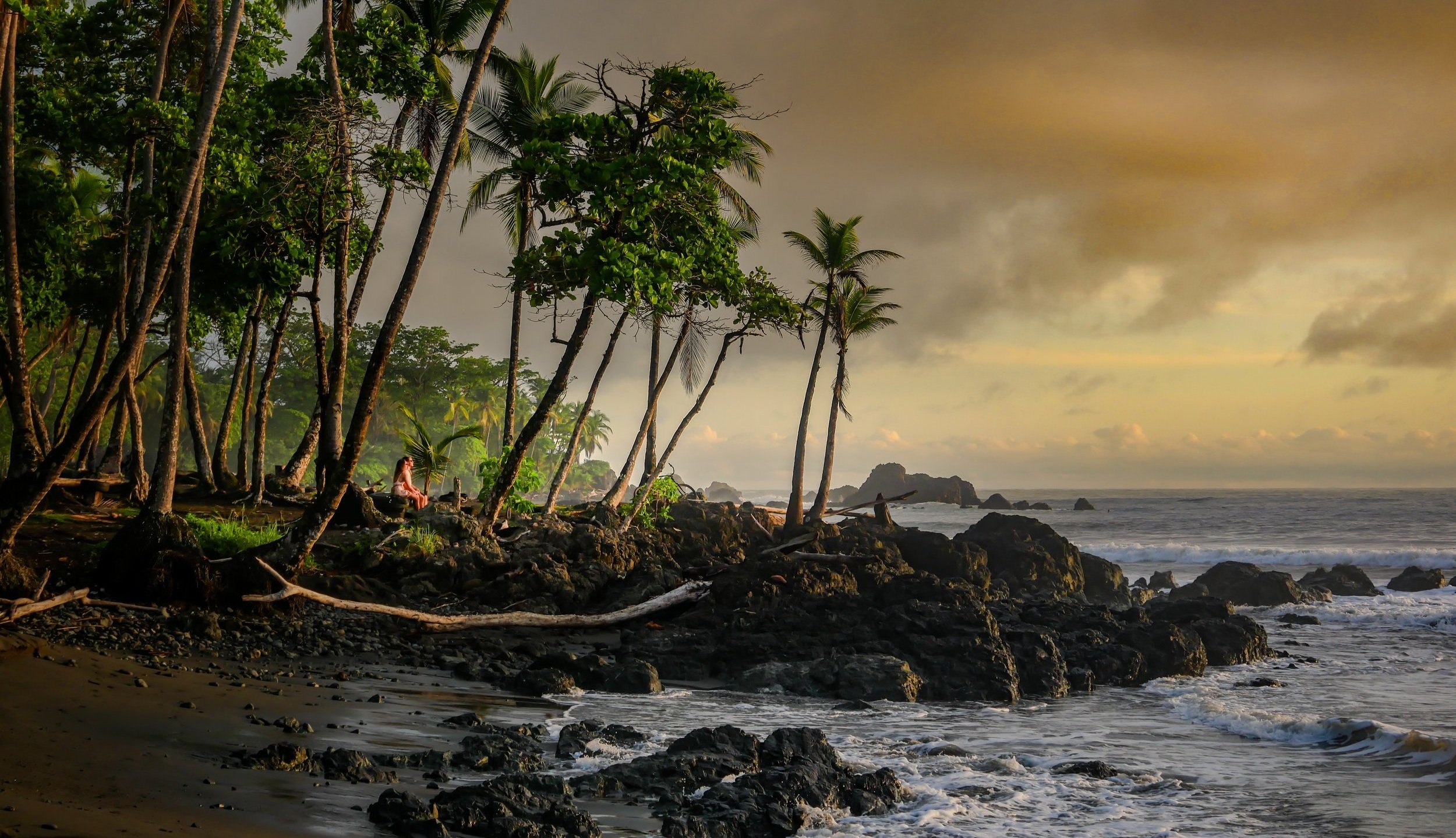 At golden hour, a couple sits side by side at the Pavones lookout, gazing toward Matapalo. Framed by trees and rich color, the scene feels timeless—so much so, it was later reproduced by artist Steve Guluk. Metal print displayed at Surf House Pavones.