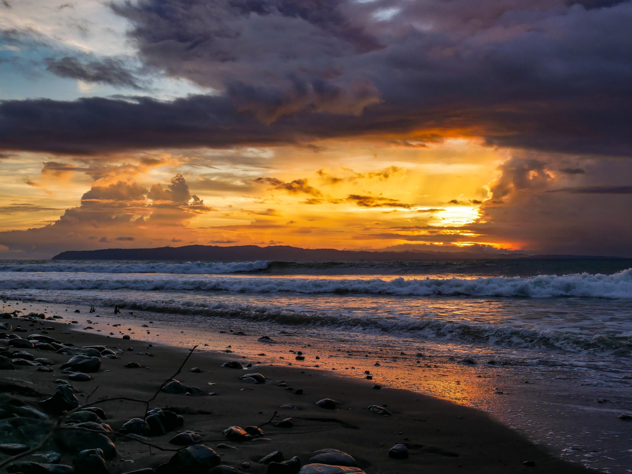 On display at Nick’s Place, this sunset shot captures a close-up of a peeling wave with Matapalo in the distance. Bright yellows pop against deep orange and purple clouds, with painterly color and texture throughout.