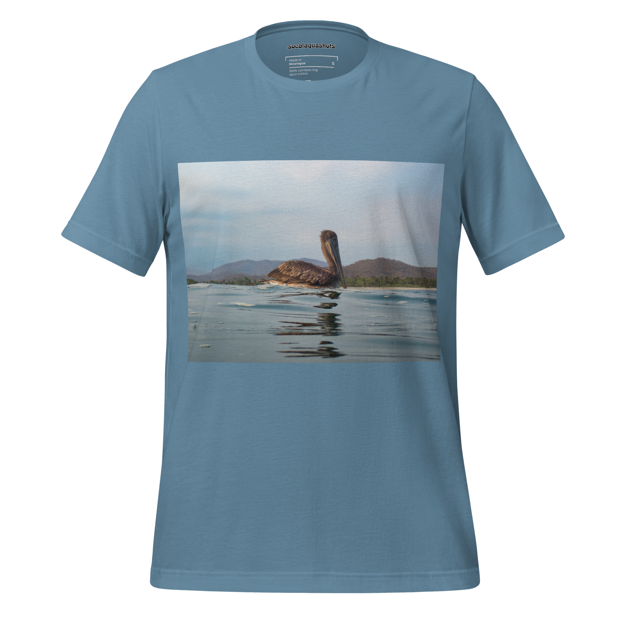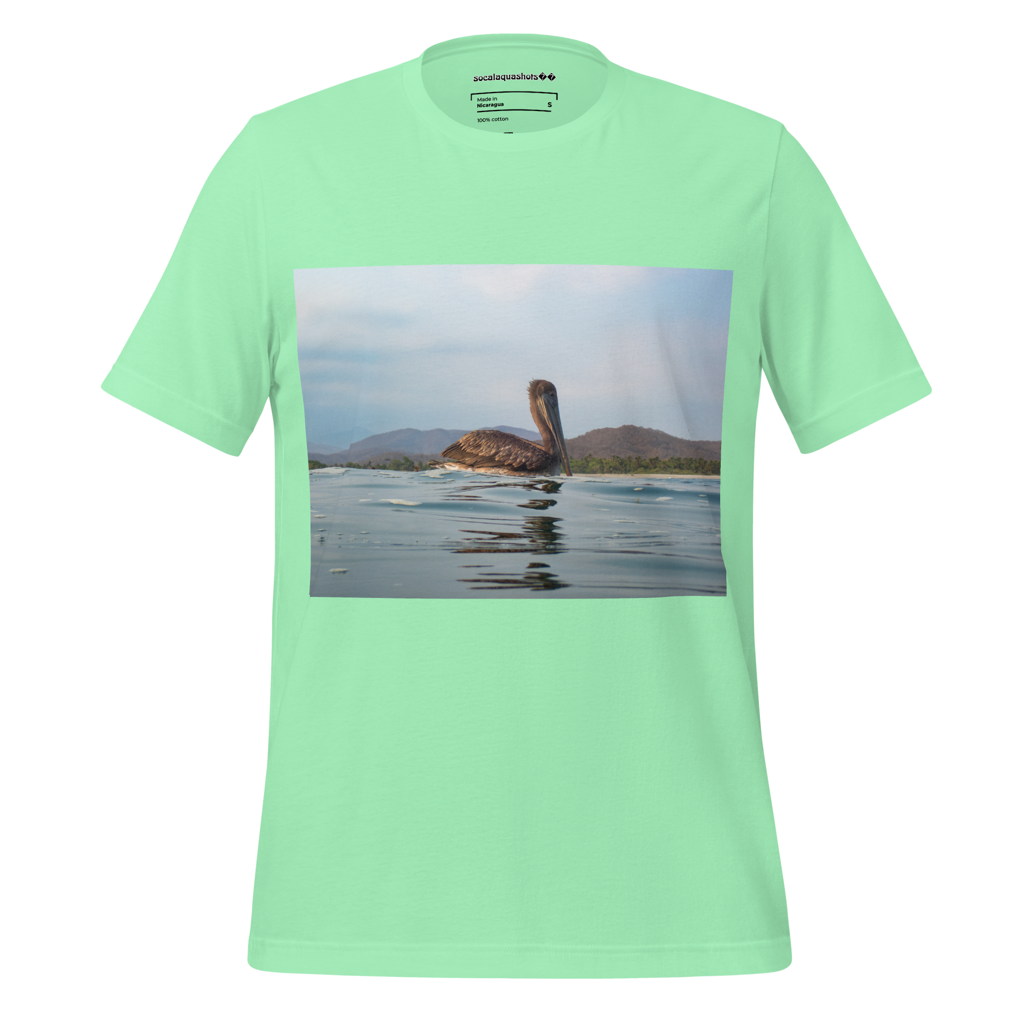 Captured while floating quietly in the waters of Oaxaca, this intimate scene reflects a rare pause between ocean, wildlife, and coastline. A solitary pelican drifts calmly beneath soft mountain silhouettes and gentle morning light, embodying the stillness, immersion, and quiet beauty found just beyond the breaking waves.