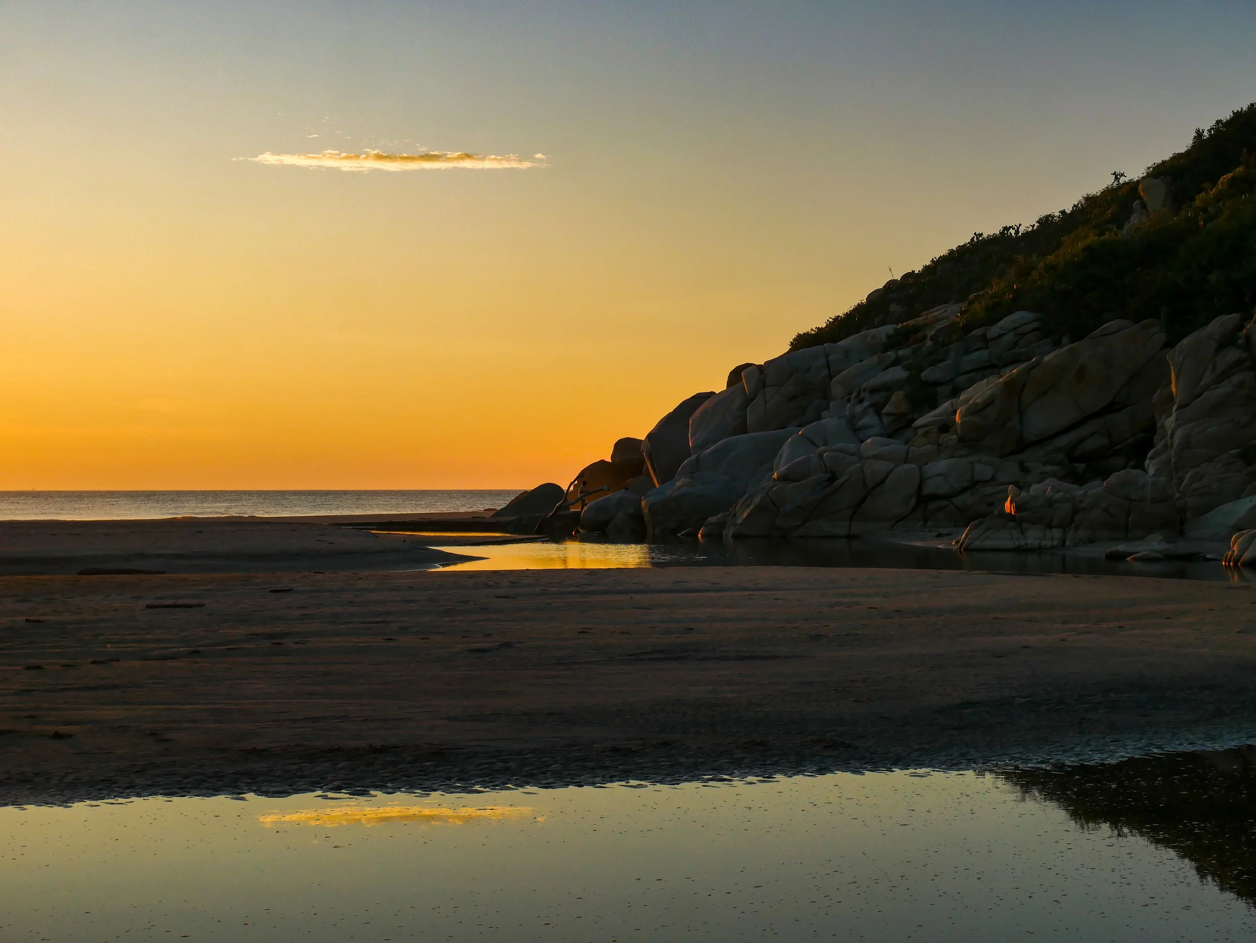 An early morning sunrise over the rriver, with golden light reflecting on the calm water. Bronze-red hues dance on the rocks, and a minimalist cloud mirrors in the tranquil reflection, creating a peaceful scene. 50% of proceeds donated.