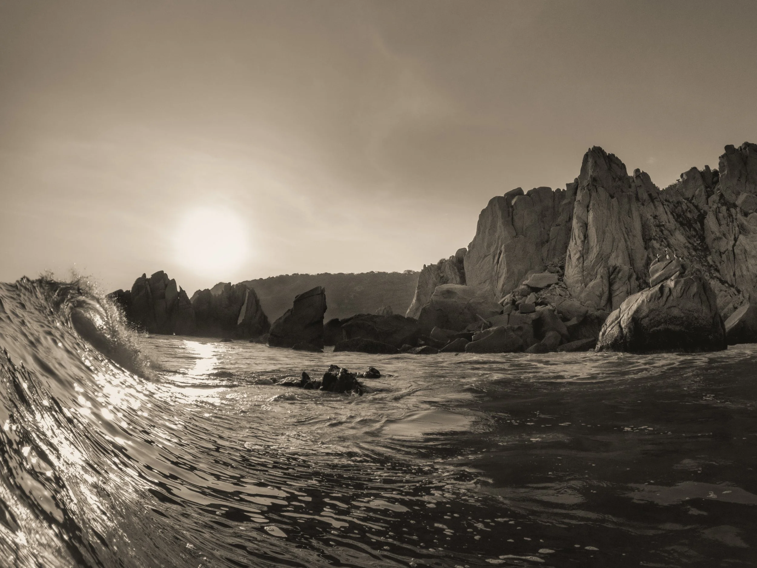 An immersive water shot, the wave breaking over the shallow reef, its power meeting the calm of the cliffs. To the right, a quiet gathering of pelicans watches, still and wise, as the ocean dances before them. 50% of proceeds donated.