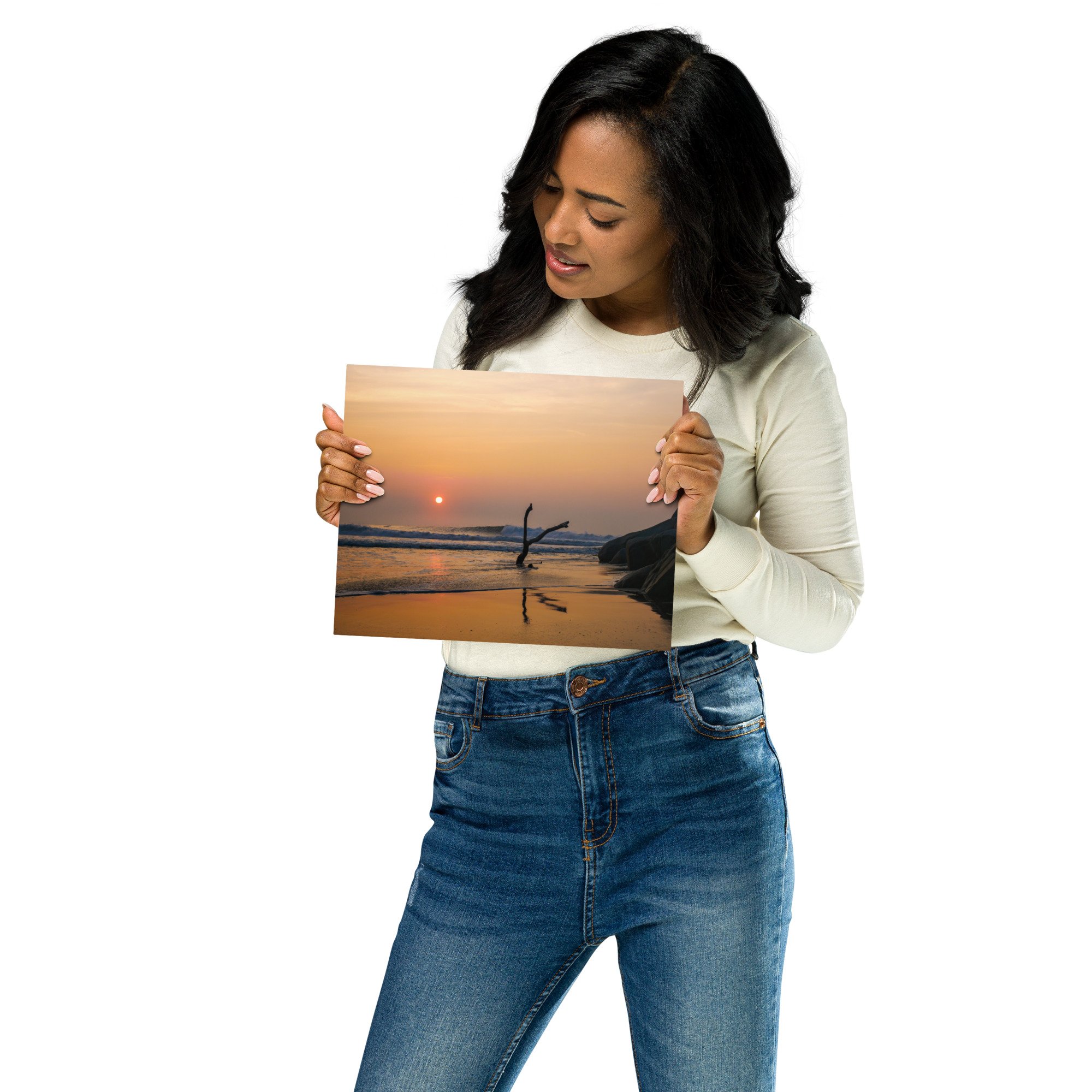 A perfect wave peels over the sandbar at sunrise, the hot orange sun just above the horizon. Driftwood stands rooted in the sand, flanked by dark boulders that frame the glowing scene. 50% of proceeds donated.